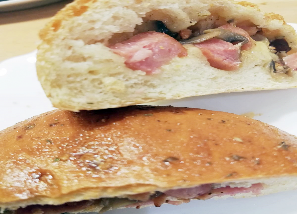Ciasto dzielimy na ok. 8 części, rozpłaszczamy, nakładamy farsz i zlepiamy. Bułeczki układamy na blaszce wyłożonej papierem do pieczenia. Smarujemy roztrzepanym jajkiem z mlekiem, oprószamy przyprawą do pizzy i wstawiamy do nagrzanego piekarnika. Pieczemy ok. 30 min. Podajemy ciepłe z sosem czosnkowym lub ketchupem.