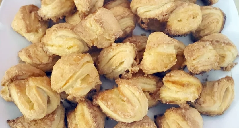 Stolnicę lekko podsypujemy mąką, rozwałkowujemy ciasto na około 1 mm grubości. Wykrawamy szklanką lub okrągłą foremką o średnicy 6-7 cm. Każdy placek obtaczamy w cukrze, następnie składamy na pół i znowu na pół tworząc trójkąt. Ponownie obtaczamy w cukrze i układamy na blaszce wyłożonej papierem do pieczenia w niewielkich odstępach od siebie. Pieczemy w temp. 175°C przez około 20-25 min do zarumienienia.