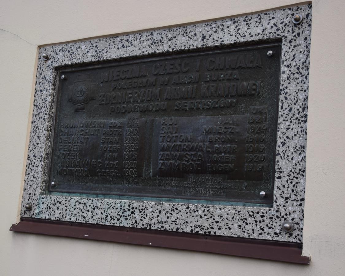 Tablica ufundowana w 1992 roku głosi „Wieczna cześć i chwała poległym w akcji Burza żołnierzom Armii Krajowej Podobwodu Sędziszów”. Znajduje sie tu 13 nazwisk.