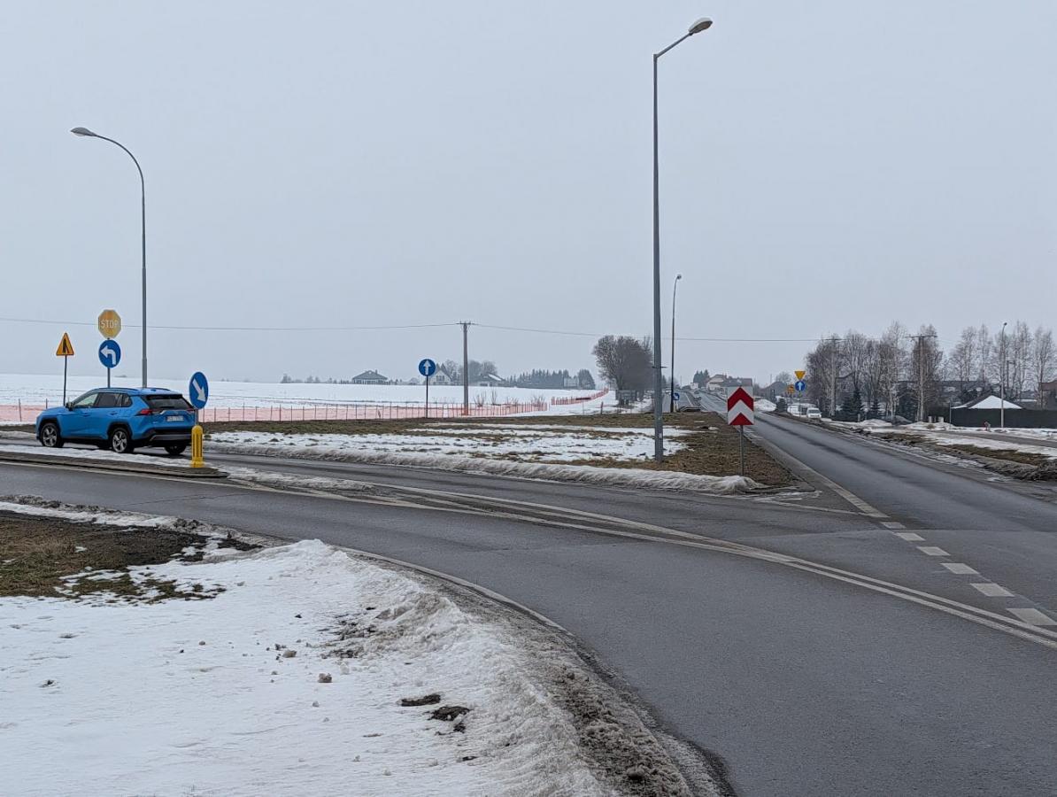 Droga krajowa nr 94 w Sędziszowie Małopolskim w rejonie planowanej budowy chodnika. Istniejący trakt pieszy na osiedlu Na Trójkącie biegnie niemal równolegle do planowanej inwestycji. Brak chodnika na trasie Ropczyce-Sędziszów przy DK94.