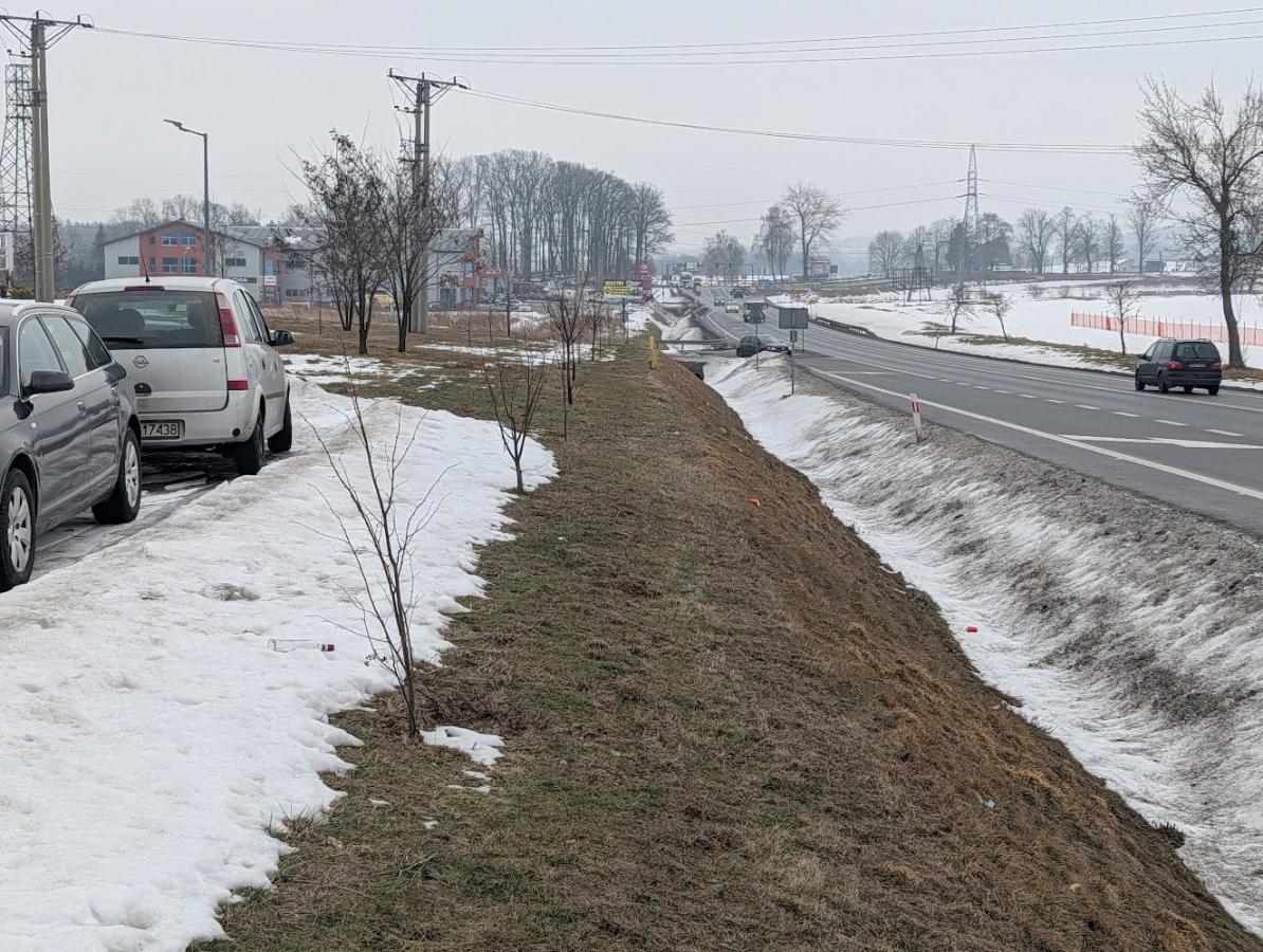 Widok obwodnicy Sędziszowa Małopolksiego DK94 w kierunku wschodnim mniej więcej na wysokości połowy ulicy Tarnowskich. Istniejący chodnik jest po lewej za samochodami, GDDKiA planuje wybudować swój tuż obok.