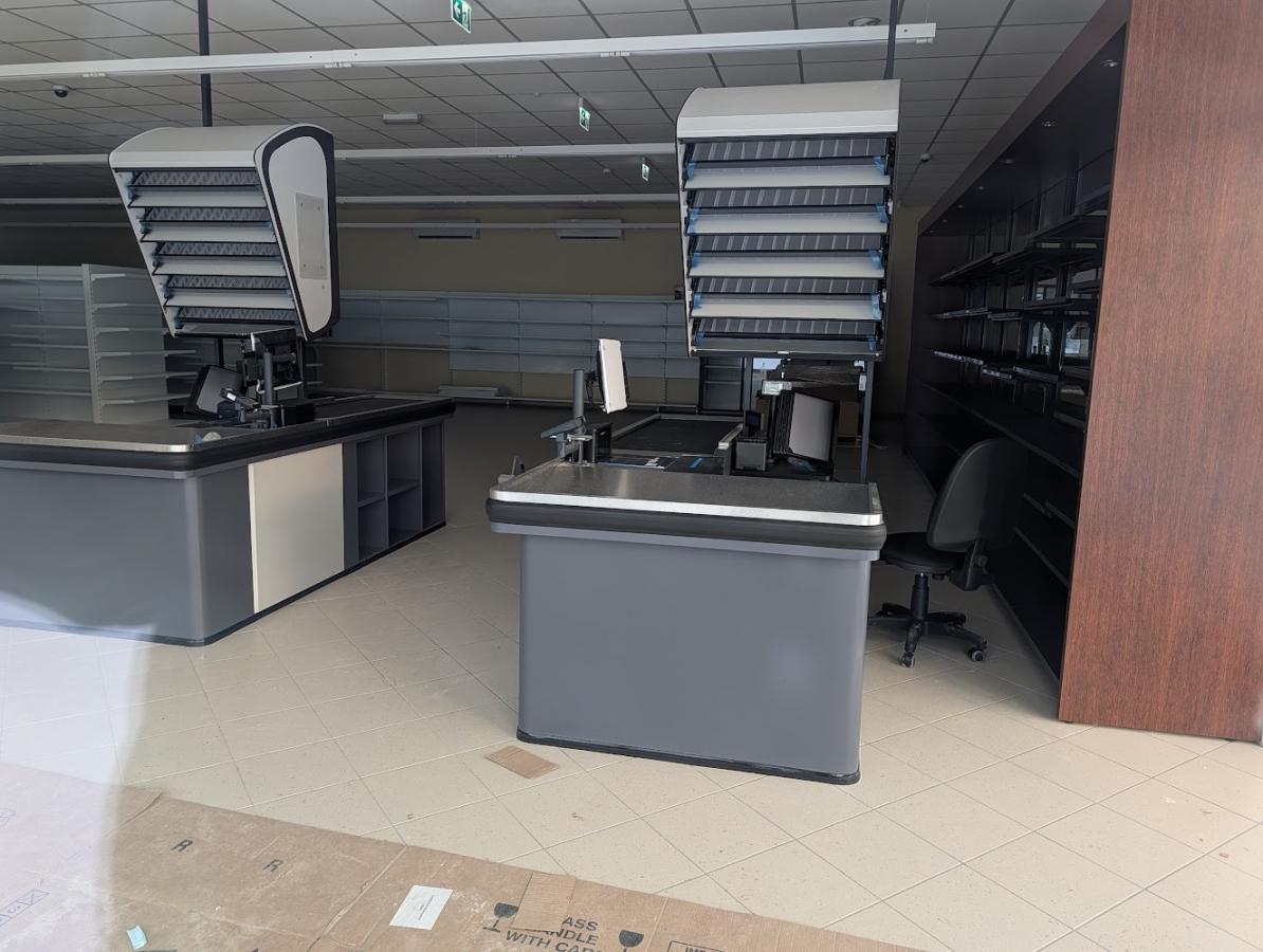 Kasy sklepu, widoczne od strony wejścia, wyglądają na gotowe do uruchomienia.