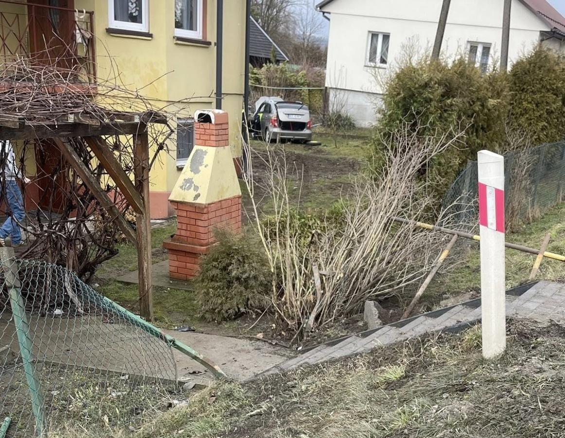 Na zdjęciu strażacy przy Hondzie, która zjechała z drogi i zatrzymała się w przydomowym ogrodzie.