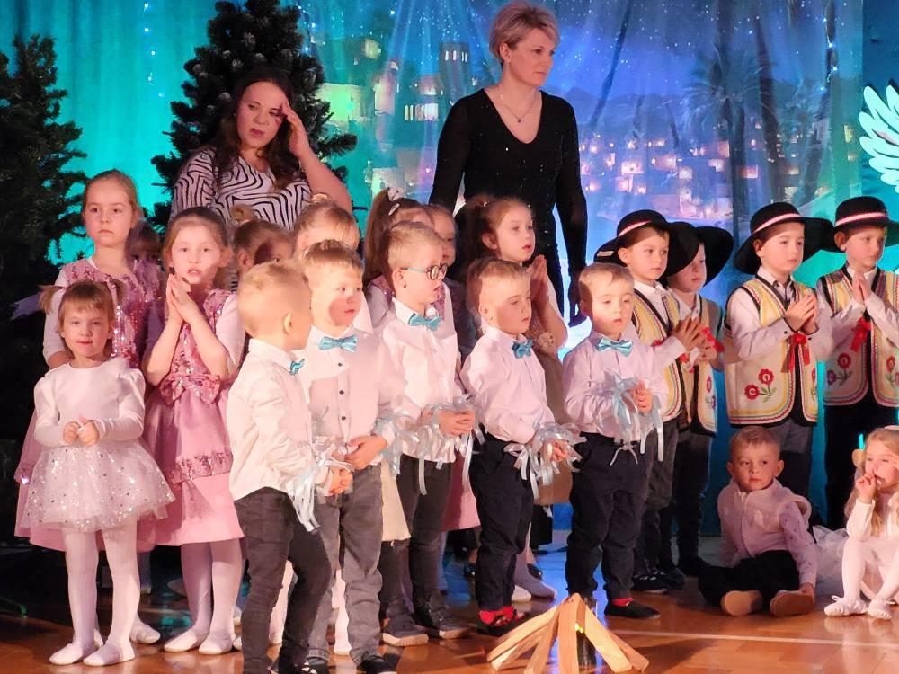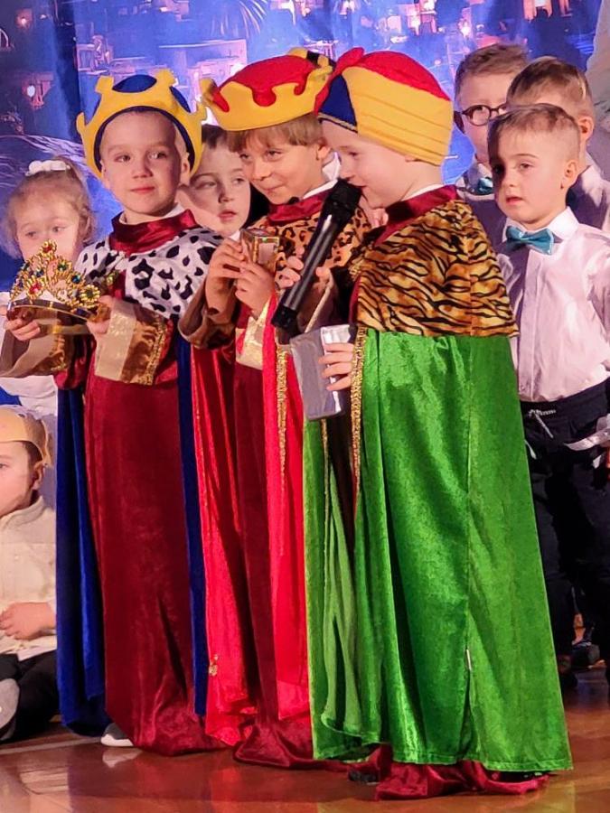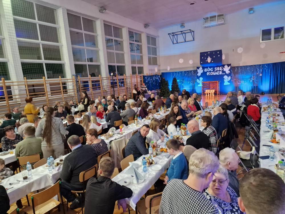 Dzieci uczestniczące w scenkach jasełek, przebrane za anioły, pastuszków, Świętą Rodzinę, mędrców. Publiczność siedząca przy długich zastawionych potrawami stołach.