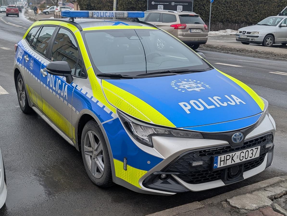 Nowy radiowóz Toyota Corolla zaparkowany przy głównej ulicy Sędziszowa Małopolskiego