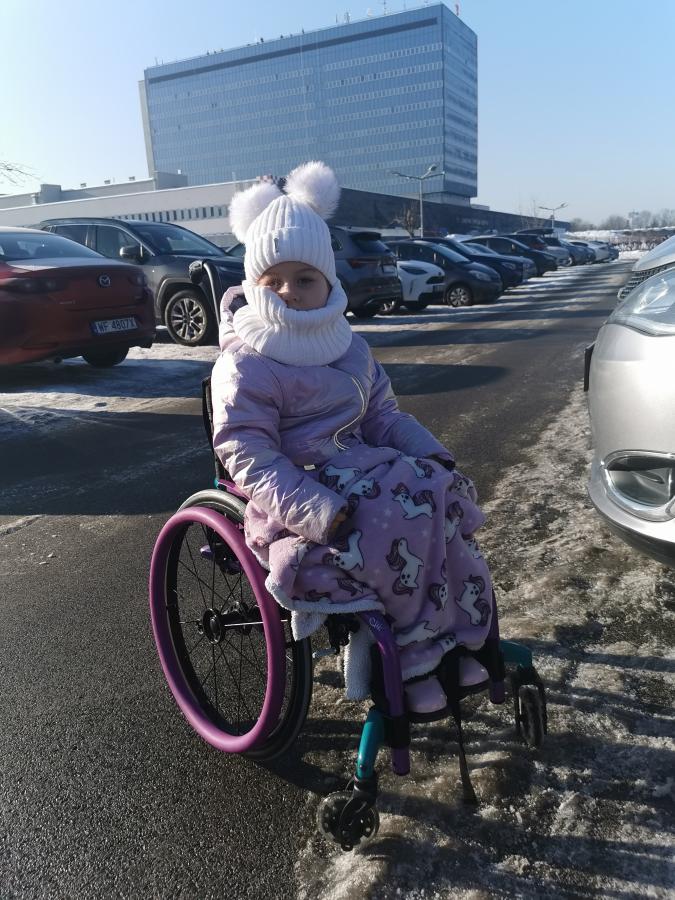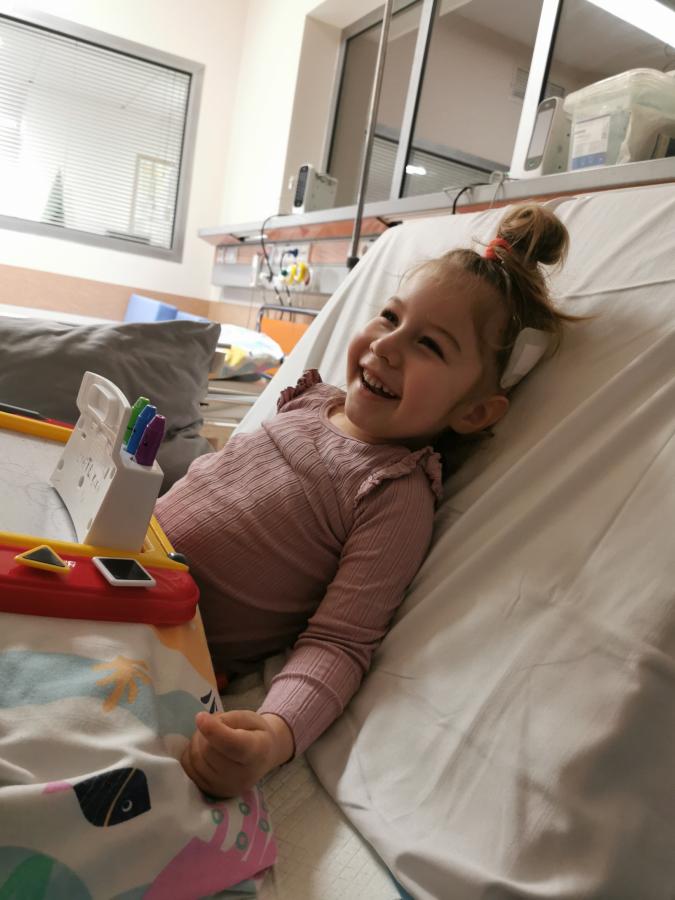 Uśmiechnięta 5-letnia Natalia na szpitalnym łóżku. Dziewczynka z determinacją pokonuje chorobę, mimo barier fizycznych."