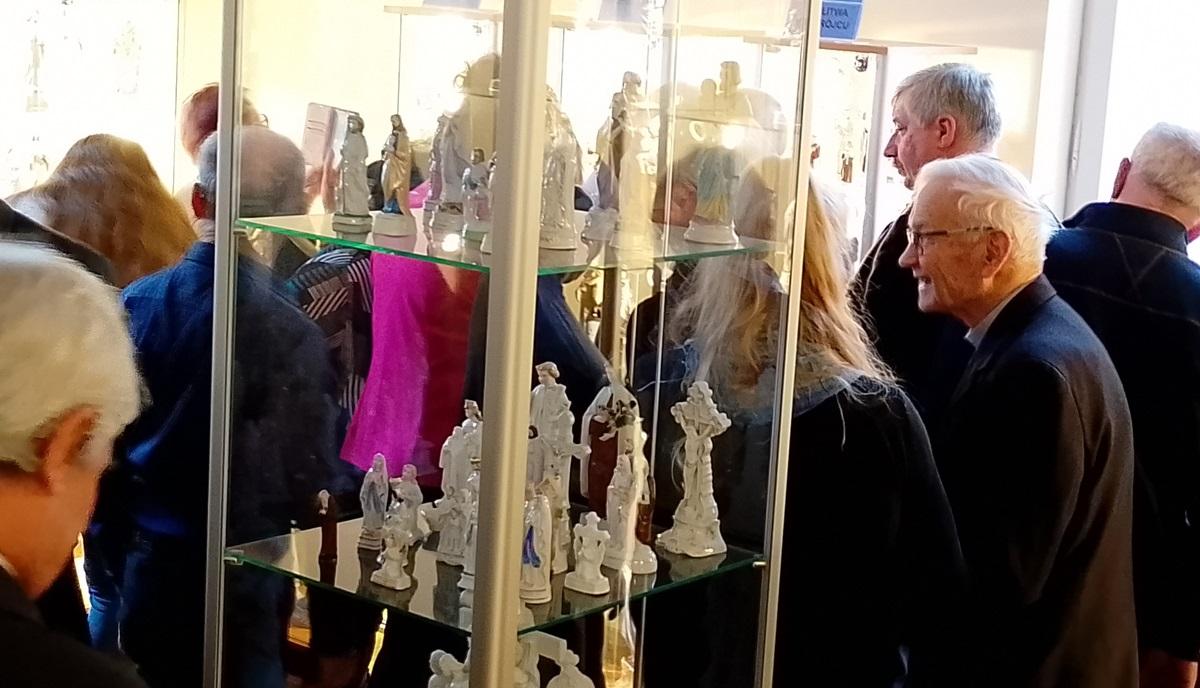 Na zdjęciu ks. Wojciech Wiśniowski prezentuje podczas wernisażu dwie spośród kilkuset figur swojej kolekcji.