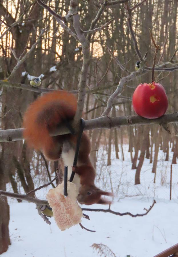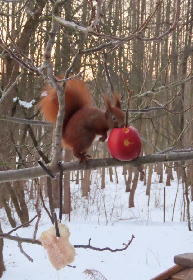 Zima w gminie Sędziszów Małopolski: rudy gość korzysta z dokarmiania ptaków. Wiewiórka dba o zbilansowaną dietę i po tłuszczach wybrała węglowodany, czyli jabłuszko.