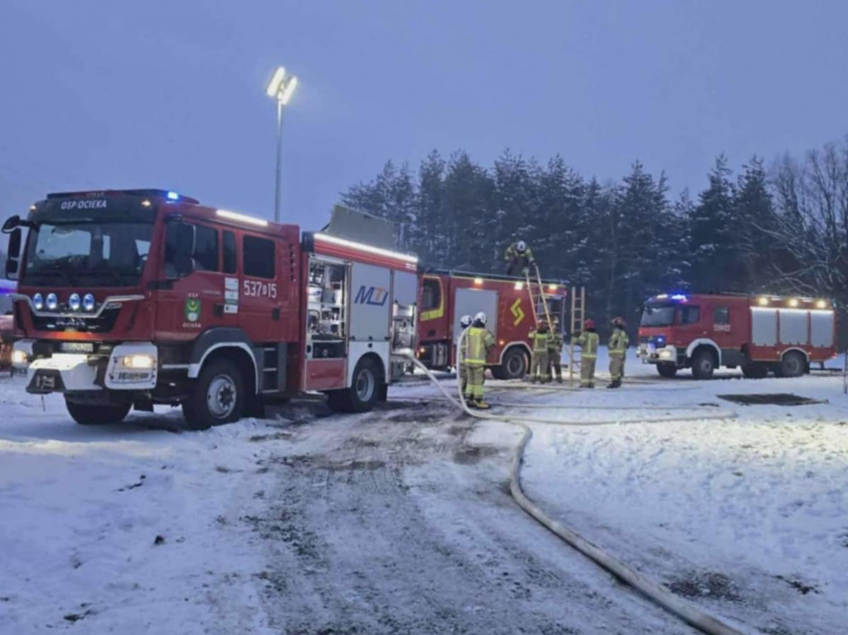 Fotorelacja z nocnej akcji gaśniczej w Woli Ocieckiej (18.02.2026). Zdjęcia dokumentują działania jednostek OSP i PSP podczas gaszenia płonącego budynku gospodarczego.