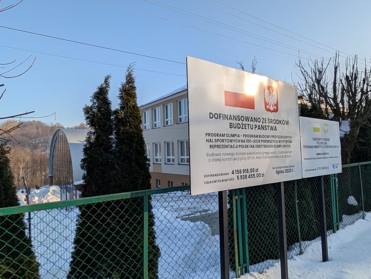 O źródłach finansowania hali i termomodernizacji informują wielkie tablice przy ogrodzeniu kompleksu szkolnego.