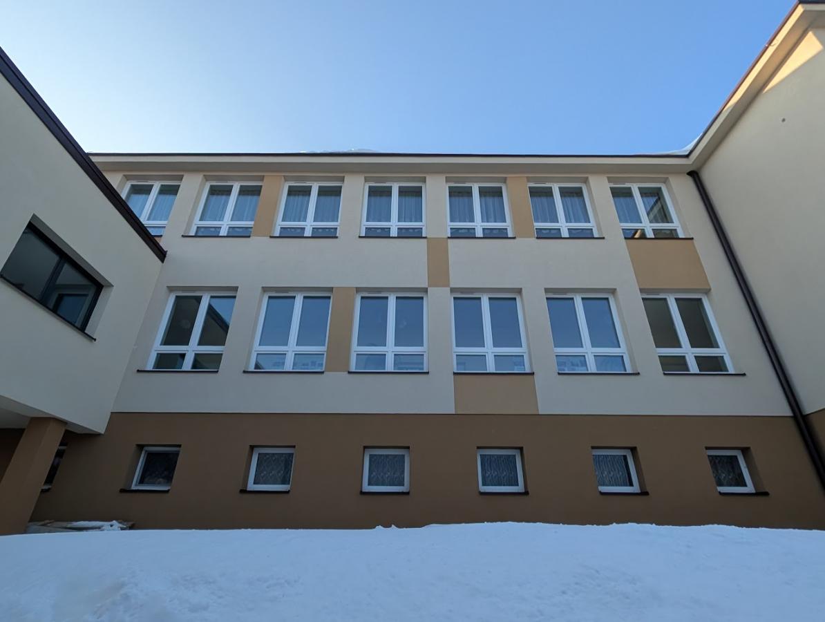 Budynek szkoły przeszedł termomodernizację, z tyłu nowe okna znacznie poprawiły wygląd elewacji.