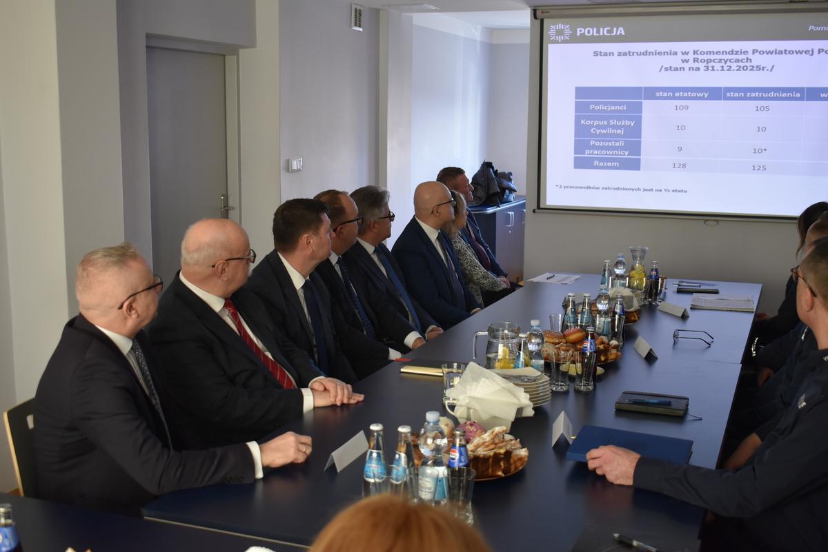Policjanci i samorządowcy siedzą przy prostokątnym stole w Komendzie Powiatowej Policji w Ropczycach.
