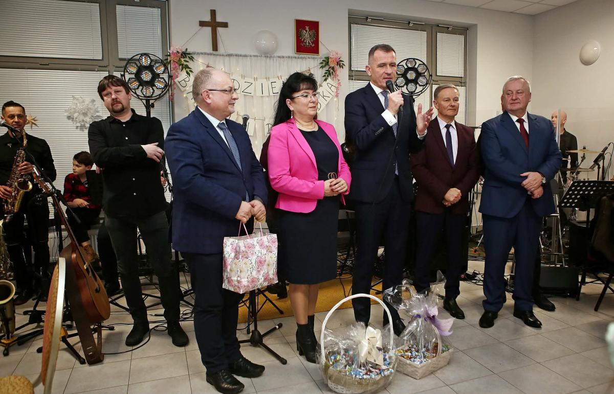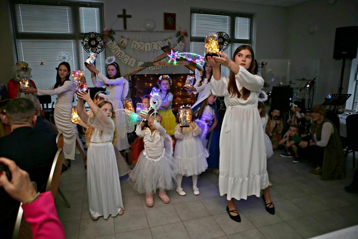 Młodzież i dzieci w strojach odgrywają role w jasełkach dla babć i dziadków. Zespół muzyczny Kolędnicy występuje podczas imprezy. Przedstawiciele samorządów Jacek Magdoń, Zofia Szybisty, Marek Pają, Jan Maroń składają życzenia babciom i dziadkom.