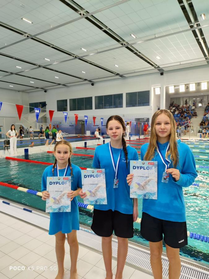 Laura Knych, Anna i izabela Stawarz z Fali Ropczyce z dyplomami za miejsca medalowe podczas startów na mieleckiej pływalni MOSiR.