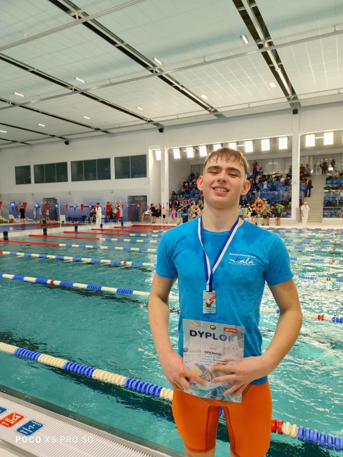 Radość Bartosza Kipy z Fali Ropczyce ze startu na mieleckiej pływalni MOSiR