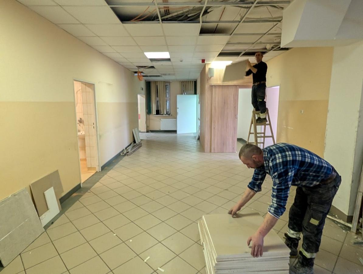 Pracownicy demontuja sufit podwieszany w korytarzu Zakładu Opiekuńczko - Leczniczego.
