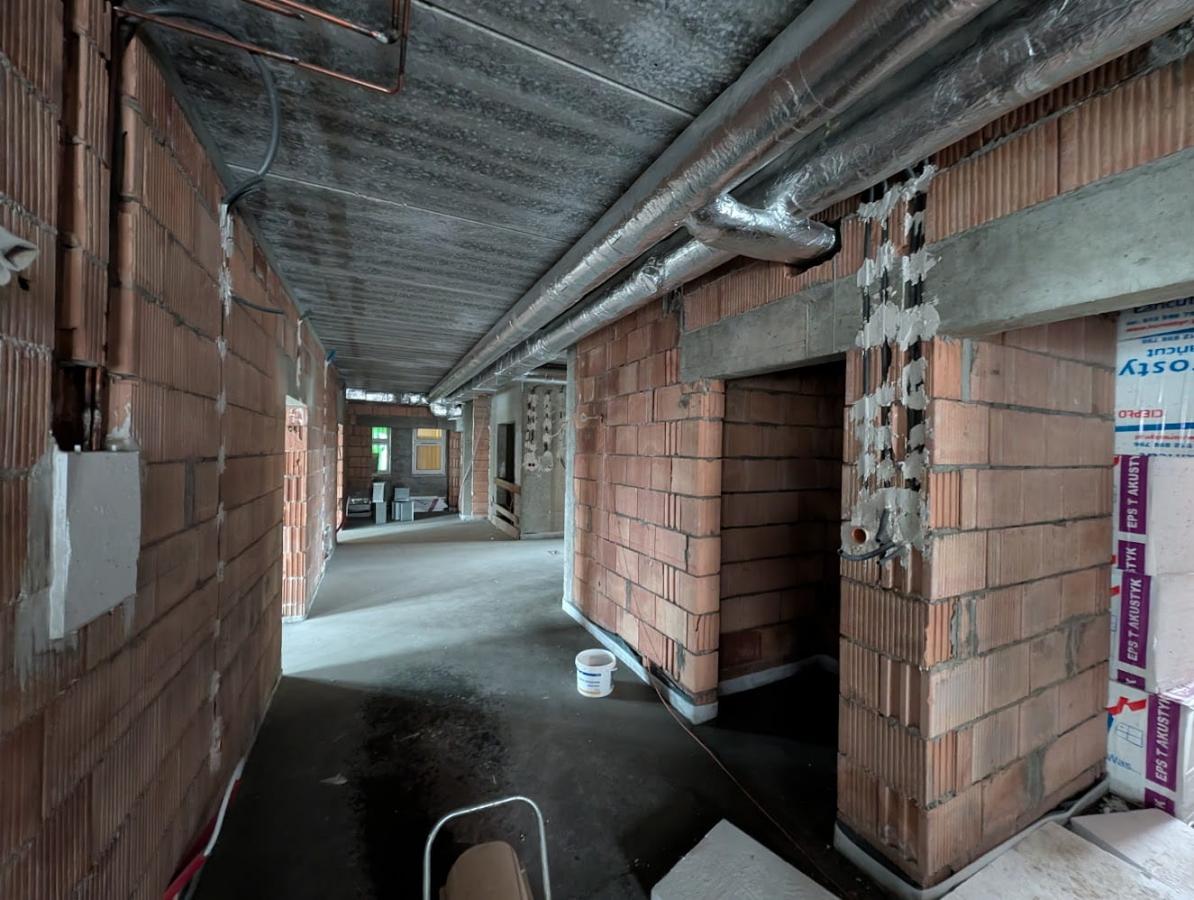 Korytarz nowego skrzydła szpitala powiatowego w Sędziszowie Małopolskim z widocznymi wylanymi już posadzkami.
