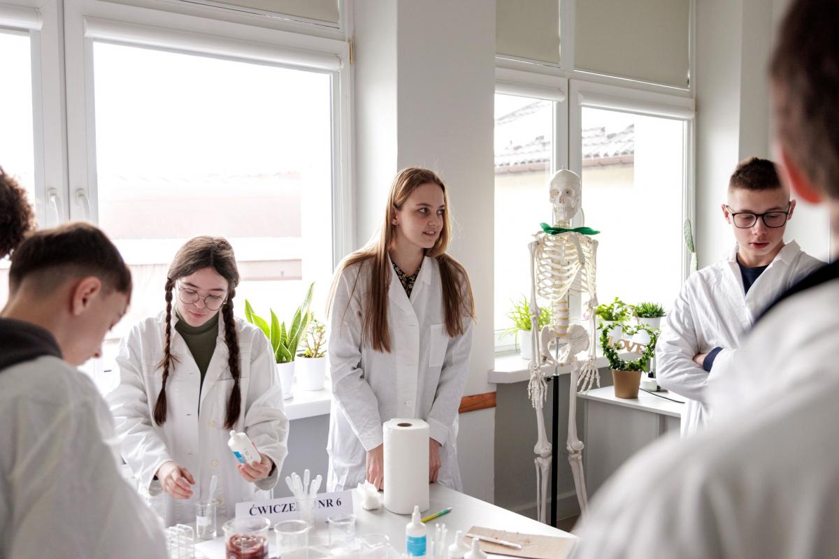 Uczniowie szkół podstawowych podczas samodzielnego przeprowadzania doświadczeń laboratoryjnych pod okiem nauczycieli ZS Ropczyce.