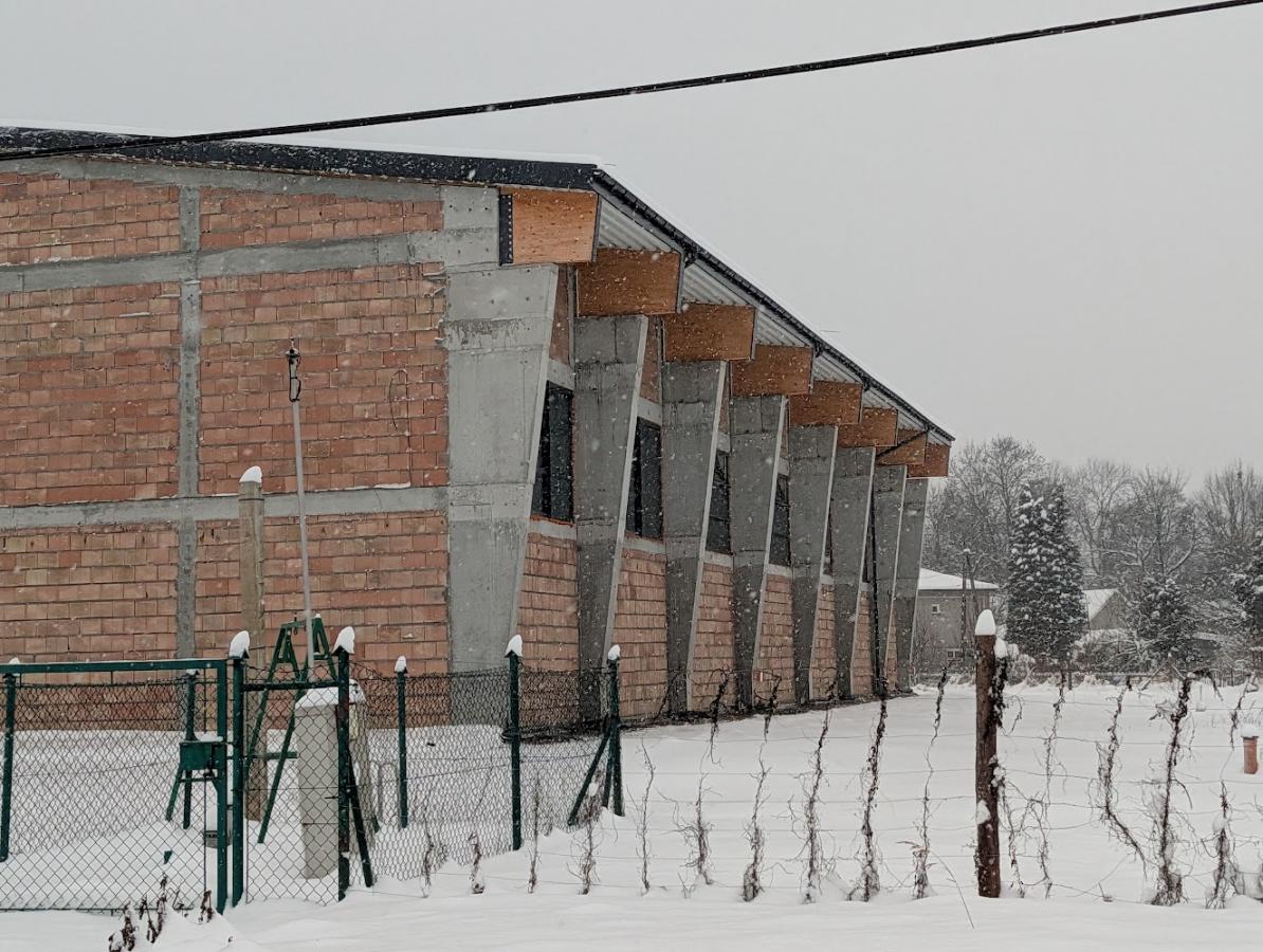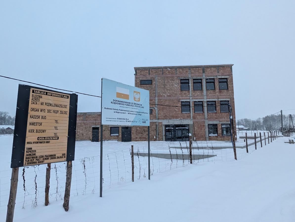 Nowa szkoła w Witkowicach to w tej chwili gmach z cegły z zamontowaną stolarką okienną i drzwiową. Tak zakończył w 2025 roku I etap budowy.
