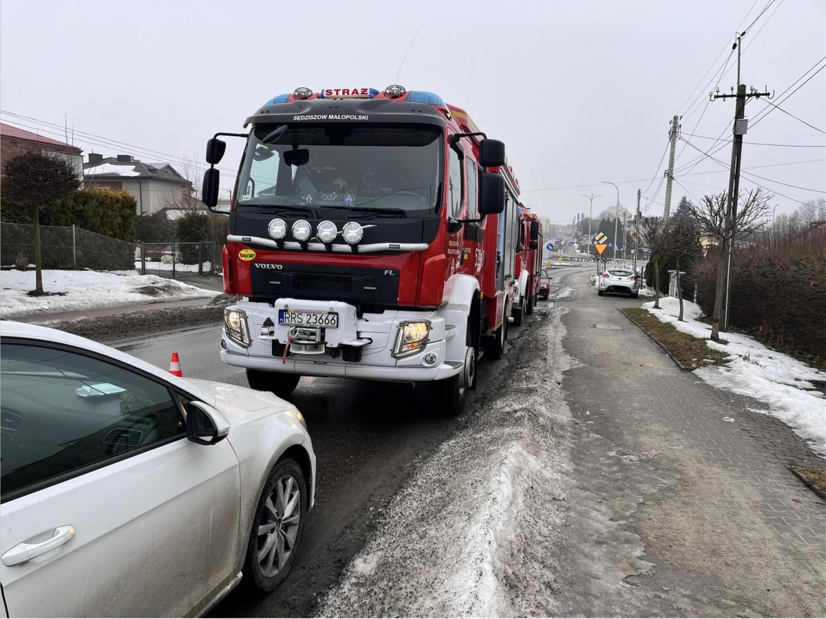 Wóz strażaków OSP KSRG Sędziszów Małopolski na ulicy Piłsudskiego podczas akcji wypompowania wody z piwnicy domu. Okolice ronda przy "Orzechu".