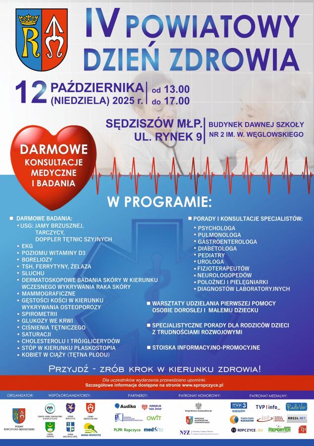 Zapowiedź nadchodzącego IV Powiatowego Dnia Zdrowia, który odbędzie się 12 października 2025 roku. Wydarzenie planowane na niedzielę ma na celu promowanie zdrowego trybu życia i edukację w zakresie dbania o swoje zdrowie. Zapraszamy serdecznie do udziału!