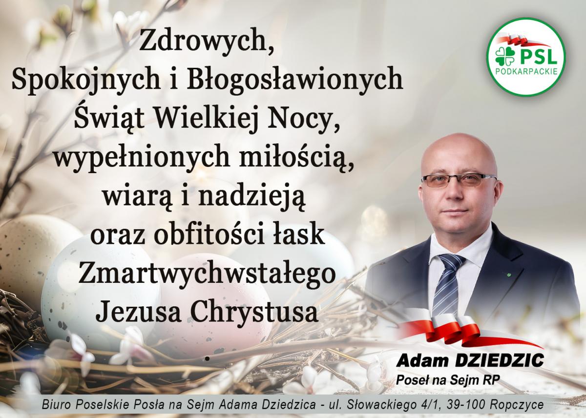 Zdrowych Spokojnych i Błogosławioinych Świąt Wielkiej Nocy, wypełnionych miłością, wiarą i nadzieją oraz obfitości łask Zmartwychwstałego Jezusa Chrystusa życzenia Adam Dziedzic Poseł na Sejm RP - slajd 1 z 1