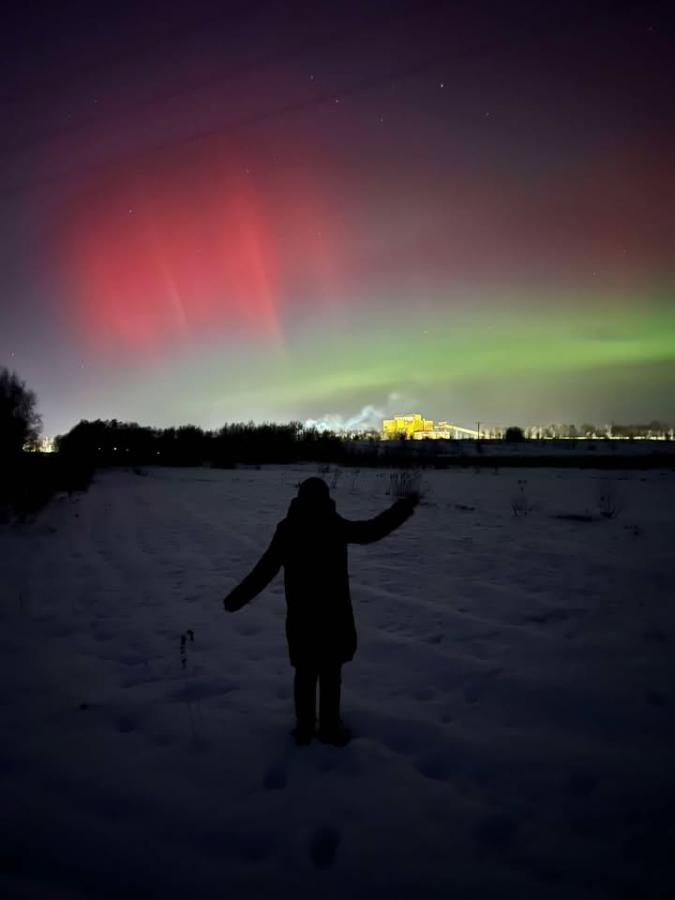 Pani Kamila Paszyńska przysłała nam zdjęcie na którym widać zorzę poniżej Zakłady Magnezytowe i kontur osoby na pierwszym planie, Piękna kompozycja