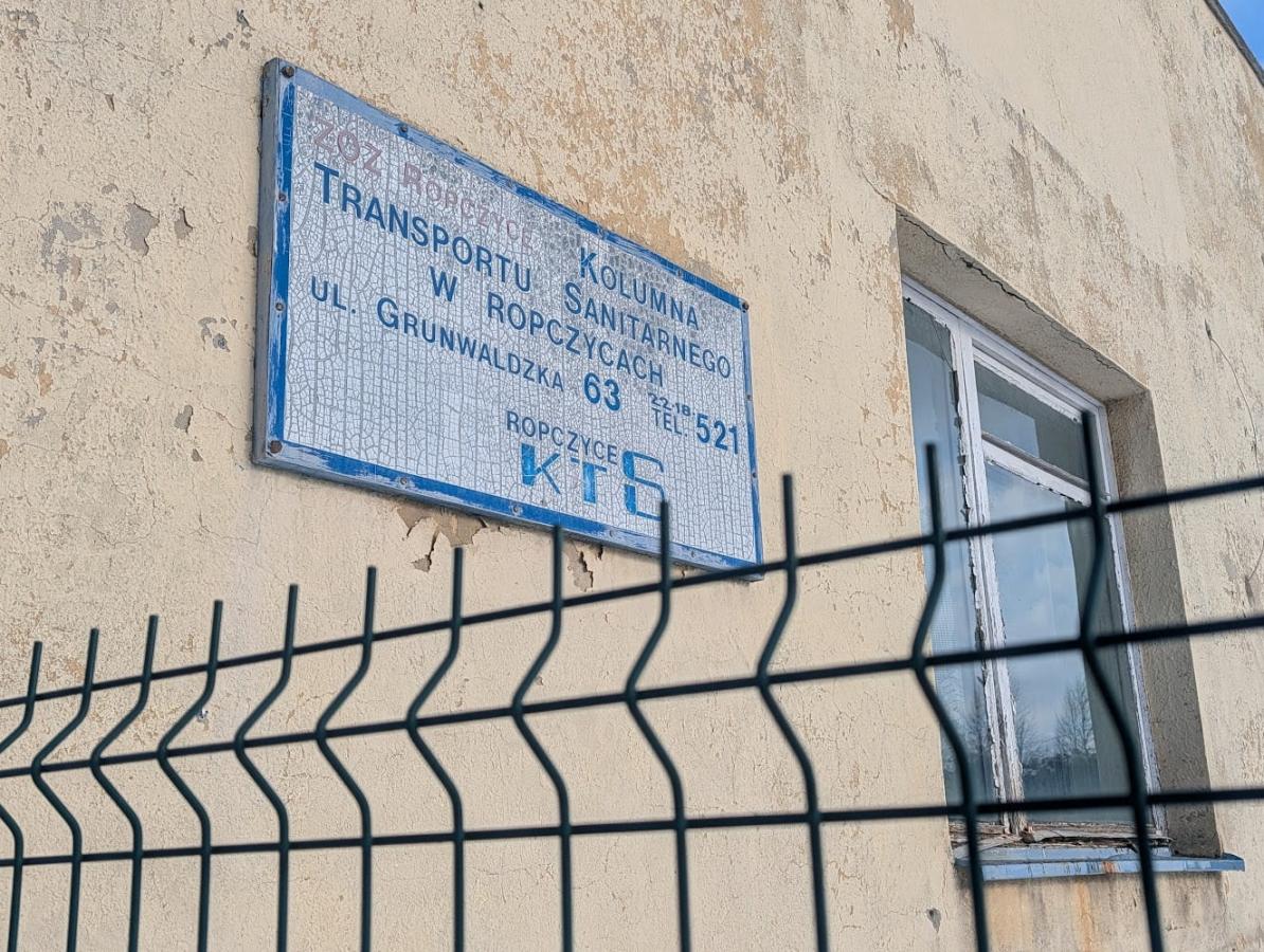 Widok działki przeznaczonej pod wynajem oraz budynku znajdującego się na niej ale wyłączonego z przetargu. Budynek ma zły stan techniczny, odpadające tynki, starą stolarkę oraz zniszczone wnętrza.